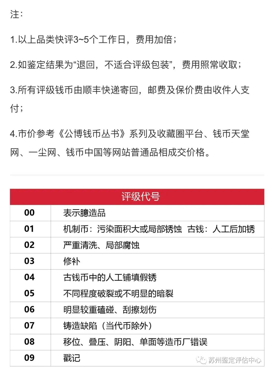 四,评级方式 21,所有鉴定为真的钱币,均进入评级程序。 22,本公司评级师一般安排二人进行,分别对分数进行复核。 23,本公司所有钱币的评级,和鉴定分开。鉴定师负责真伪判断,必要时对评级给出意见和建议。评级师负责对币的品相作出判断,给出分值。 附则:瑕疵代号表:01-机制币污染面积大或局部锈蚀、古钱中代表人工后加锈或字面已被锈斑覆盖;02-严重清洗、局部腐蚀;03-各种修补;04-表面人为加工着色、打磨、堆填假锈等改变原貌的行为;05-不同程度破裂或不明显的暗裂;06-明显较重磕碰、刮擦划伤;07-各种铸造缺陷情形;08-移位、叠压、阴阳、单面等造币厂铸造错误、工艺瑕疵;09-戳记;00-臆造币。