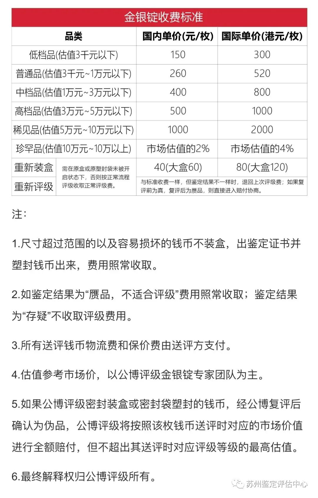 五,责任与赔偿 24,本公司对所有客户寄到、送到的钱币负有保管责任。如签收后发生丢失、损坏,均由公司负责。签收前发生在邮寄过程中的丢失和损坏,不在本公司责任范围内。寄回客户过程中发生的丢失、损坏,由寄送公司负责赔偿解决,本公司负查询、协助责任。客户签收后该邮件不再与本公司有关。 25,本公司签收后,因不可抗力(地震、火灾、交通意外等)发生的损坏、丢失,按一般经济仲裁方式协商解决,尽一切可能避免走司法程序。 26,本公司所有包装、鉴定盒,在5年内,因材料质量问题造成的破裂、开缝、变形、变色等,本公司免费更换一次新盒子。不当保存及人为损坏不包括在内,但在10年内均可享受一次成本价更换新盒。所有鉴定过并密封入盒的钱币,在保存时均应避免阳光直射及高温、潮湿环境。 27,本公司所有鉴定后退回不包装的钱币,如有提出异议者,我们可以接受复鉴申请,复鉴为相同结果时,客户需再次支付相应的鉴定费用。如复鉴结果不同,则免收费用并及时完成评级包装。如有疑问币误装入盒,复鉴为假时,不收复鉴费用,并按该币当前一个月前后同品相平均价格赔偿客户,或按我公司鉴定师共同评估市价赔偿。 28,所有有异议的鉴定币,如我公司已有复鉴结论,但客户仍然坚持异议,则客户需提供该币真或假的证明。我公司只接受证明: 三名或三名以上钱币行家的书面意见。本公司认可全中国(含港澳台)及国外的钱币界各领域顶级专家、内行、藏家约100人。质疑者只需从我公司提供的名单中任选3名相关领域的行家,去取得书面签名认可为“赝品”或“真品”并说明理由的材料来,我们经过电话核实,即可当场办理赔偿。 此外,任何其他公、私形式的鉴定证明本公司一概尊重,但均不采纳为赔偿依据。 29,客户邮寄钱币时应尽量采用保价邮寄,保价费、邮寄费按惯例,均由客户自己负担。六,鉴定证书规则 30,本公司针对不需要包装,但需要鉴定真假的客户,开具统一规格的鉴定证书。 31,所有真品,均开具鉴定证书,币的清晰图片打印在证书上。32,需要同时标明目前市价的钱币,客户需要证明是单位或司法需要。本公司不针对个人开具任何钱币的市价证明。 33,本公司不对任何个人开具赝品证明。 34,因工作或其他原因需要赝品证明的任何单位,需提交加盖单位公章的介绍信或委托书,我公司才开具赝品证明。